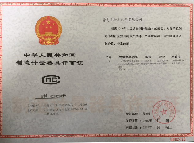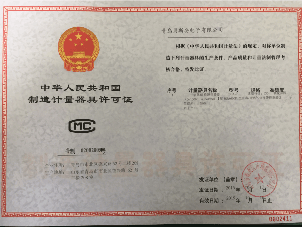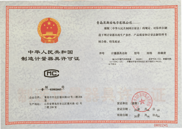 我公司是青島市具有國家質(zhì)量技術(shù)監(jiān)督部門頒發(fā)的計(jì)量器具生產(chǎn)許可證的生產(chǎn)企業(yè);獲得國家防爆電氣產(chǎn)品質(zhì)量監(jiān)督檢驗(yàn)中心頒發(fā)的防爆合格證;獲得國家公安部消防產(chǎn)品合格評(píng)定中心頒發(fā)的消防產(chǎn)品形式認(rèn)可證書。